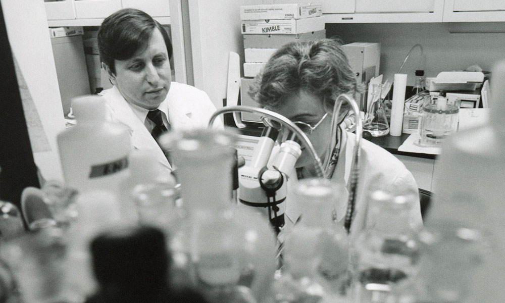 Eliot L. Berson, MD, and Susan Y. Schmidt, PhD, in the newly-formed Berman-Gund Laboratory, 1974.