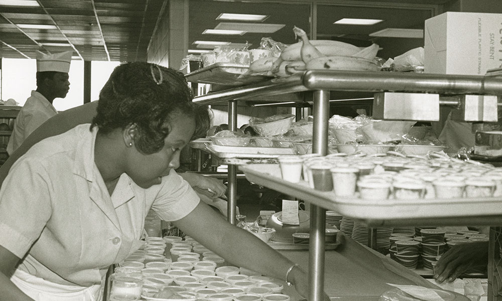Ethel Hargrove reaches for a tray as she prepares dessert in the cafeteria, 1979.