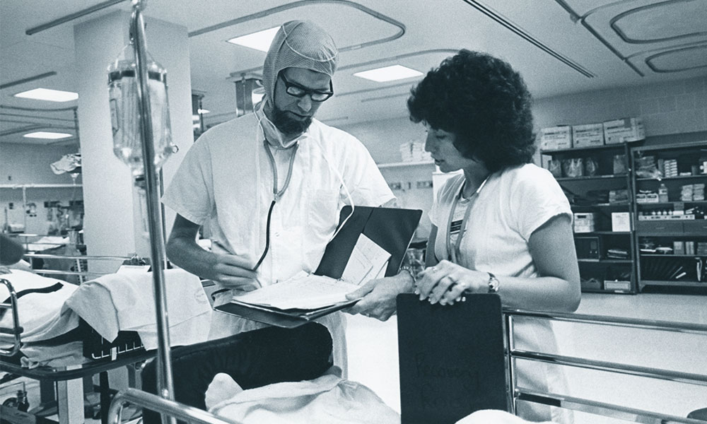 Anesthesiologist John V. Donlon, MD, and Nurse Sally Bellina, RN, review a patient’s record in the recovery room, 1978.