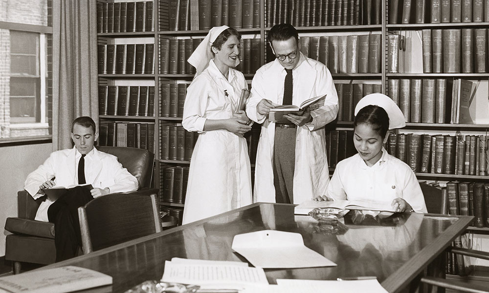 Doctors and nurses read in the Howe Library, 1956. Standing at right is Librarian Charles P. Snyder.
