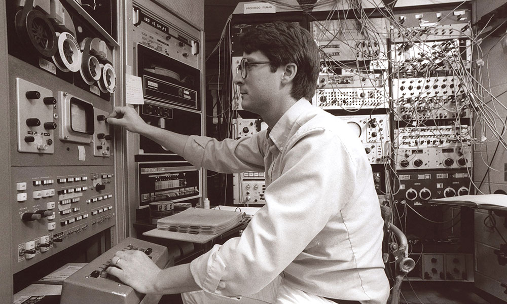 M. Charles Liberman, PhD, performs neurophysiological experiments in the Eaton-Peabody Laboratory, 1982.