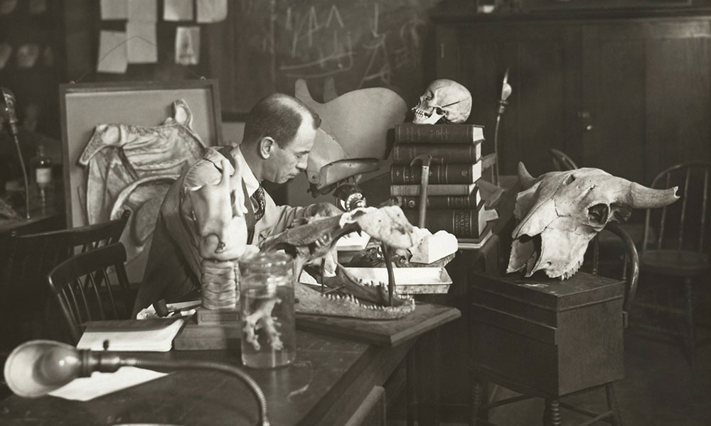 A student studies head and neck anatomy as part of the Mosher Course, 1935.
