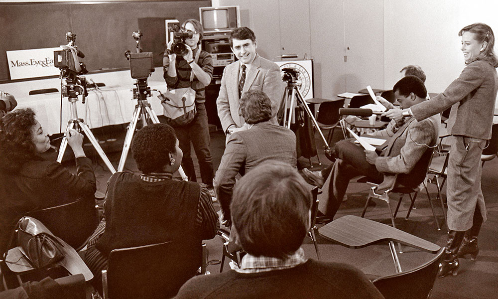 Members of the press surround Joseph B. Nadol, Jr., MD, during a press conference held at Mass Eye and Ear after he performed the first cochlear implant in New England on December 18, 1984.