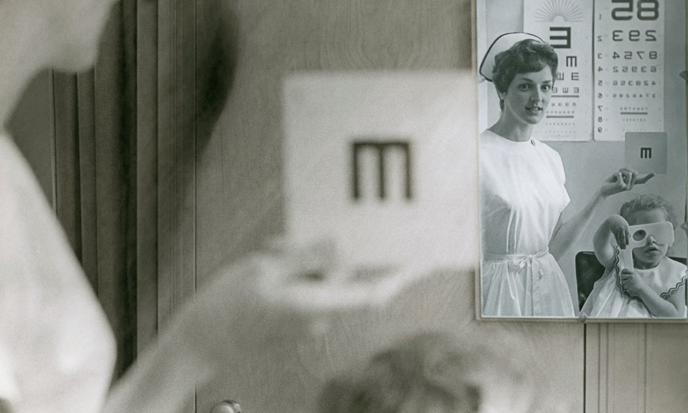 A nurse tests a child’s vision in the eye clinic, circa 1950s.