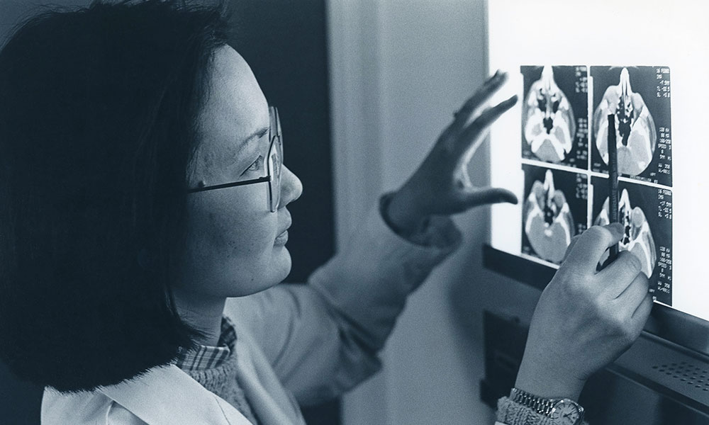 Radiologist Gloria Chang, MD, examines a CT scan, 1982.