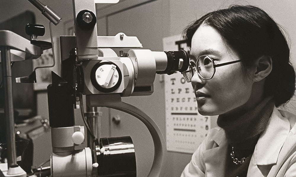 Ophthalmology Resident Delia N. Sang, MD, examines a patient, 1970s.